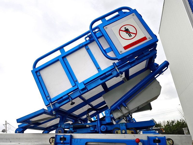 2、貨斗采用2種安全方式實現(xiàn)防墜落,貨斗采用二次升降,降低離地高度的同時,減小對梯臂壓力。